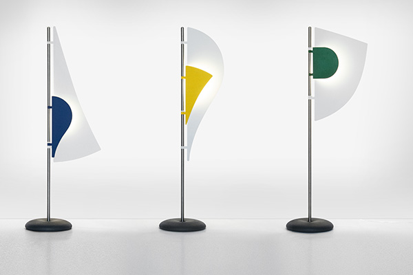 Chaque lampe présente une combinaison de deux voiles en aluminium peint. La voile principale est blanche et la seconde, plus petite, est colorée. Elles sont montées sur un mât central afin de pouvoir être tournées dans la position souhaitée.