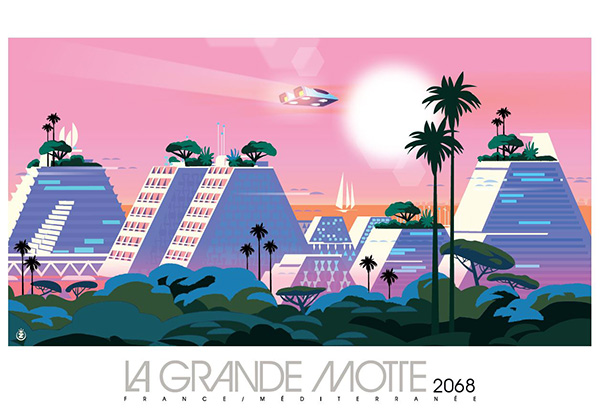 Sa collection de sept visuels de La Grande Motte plonge dans un univers chic et glamour, délicieusement rétro, invitant au voyage.