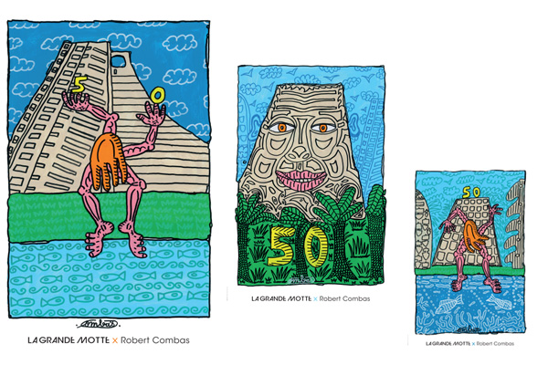 Une fresque libre et détonante pour célébrer l’identité de La Grande Motte : Robert Combas a ainsi réalisé quatre affiches uniques à l’occasion du cinquantenaire de La Grande Motte. Il reprend et réinterprète les éléments emblématiques de la ville : sa nature luxuriante, ses espaces verts et son architecture audacieuses. La façade du Palais des Congrès a été à cette occasion transformée en écran géant et a permis la projection d’une fresque lumineuse mettant en scènes les éléments graphiques de la ville.