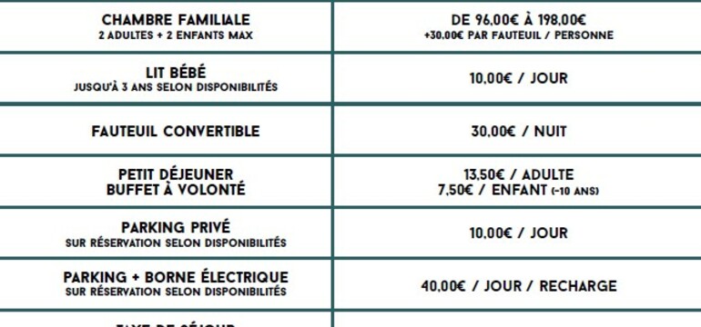 | Supplément parking | 10 € | 10 € | 10 € | 10 € | 10 € | 10 € |