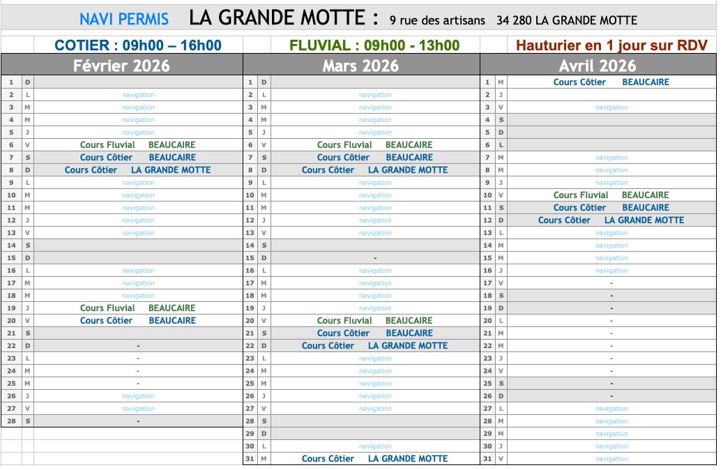 Navi Permis est un établissement spécialisé dans la formation aux permis bateaux qui propose des formations sérieuses et rapides aux permis côtier, fluvial et hauturier, adaptées aux besoins et aux disponibilités de chacun. Situé à deux minutes du port, à proximité du quartier du Couchant et des restaurants, il accueille ses candidats dans un cadre agréable et facilement accessible.