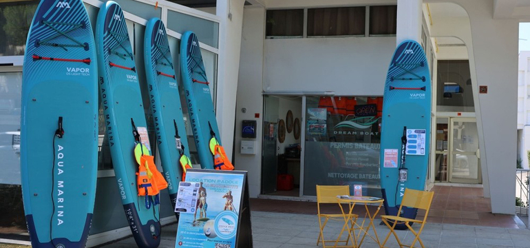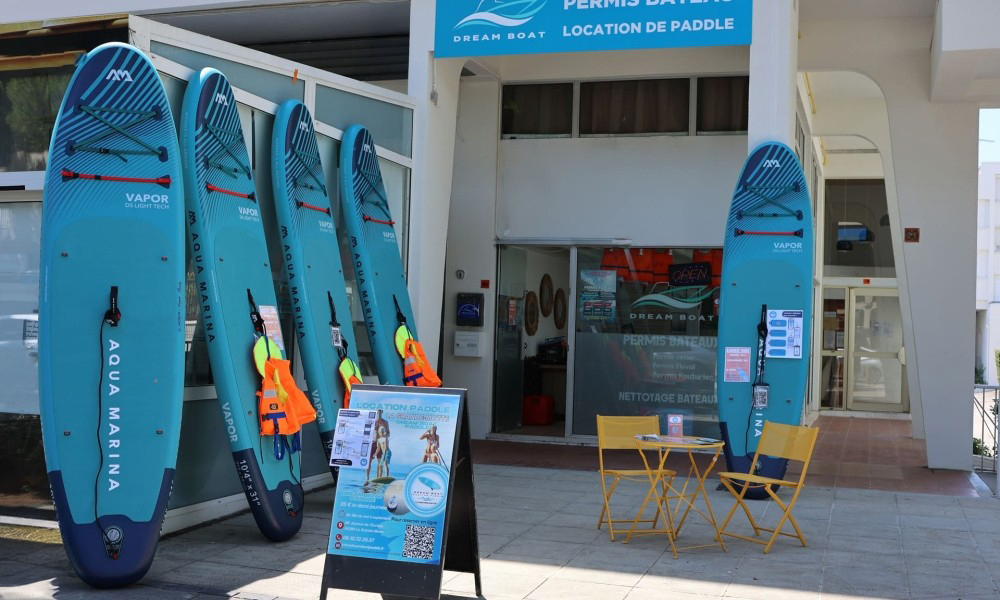 Louez un paddle à La Grande Motte et profitez du soleil et de la plage entre amis ou en famille ! Chez Dream Boat, Les paddles sont légers, stables et adaptés aussi bien aux adultes qu’aux enfants. L'équipe met à votre disposition des gilets de sauvetage, des pagaies réglables et vous donne des conseils techniques pour que vous passiez un excellent moment sur l’eau. Récupérez votre paddle directement à l’agence Dream Boat, idéalement située à 100 mètres de la plage, sur l’Avenue de l’Europe à La Grande Motte. Le spot parfait pour démarrer votre aventure !